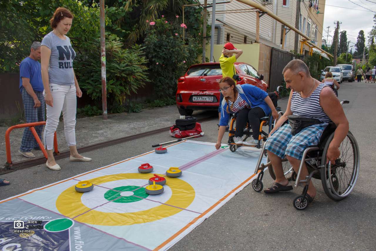 В 17 часов поиграли в кёрлинг на земле, который принесла местный спорт-культ-организатор Лариса. Новый для меня вид оптимизированного для инвалидов спорта. Многие из которых, включая этот, имхо, превращаются больше в детскую игру. Играли на улице на асфальте, а некоторые проходящие прохожие были очень заинтересованы происходящим и даже останавливались посмотреть. Изначально пришёл пофоткать, но тоже пару раз бросил пластмассовый "камень". Всё происходило на наклонной поверхности, искать другое место не стали, расстелили поле перед домом. Но если в боччу приходилось играть и не в таких неподходящих местах, то какая разница.