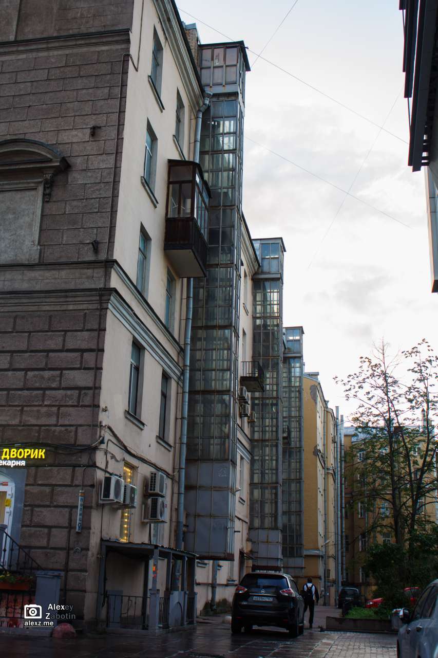 После того как немного отошли от метро, обратил внимание на старое 5тиэтажное здание, к которому были пристроены лифты.