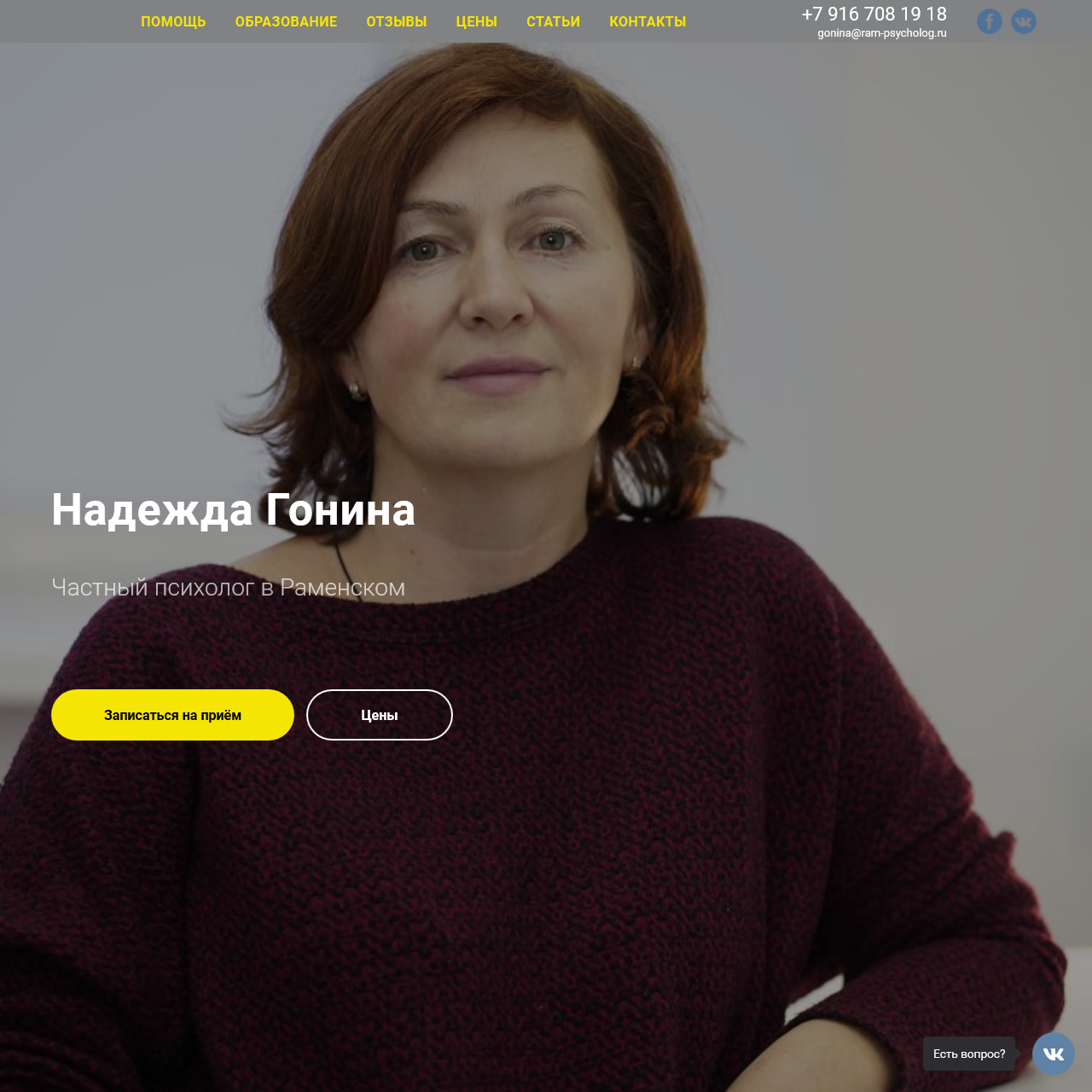 Сайт: Частный психолог в Раменском - Надежда Гонина Адрес: ram-psycholog.tilda.ws Старый адрес: ram-psycholog.ru CMS: Tilda Дата создания: 7 июня 2019